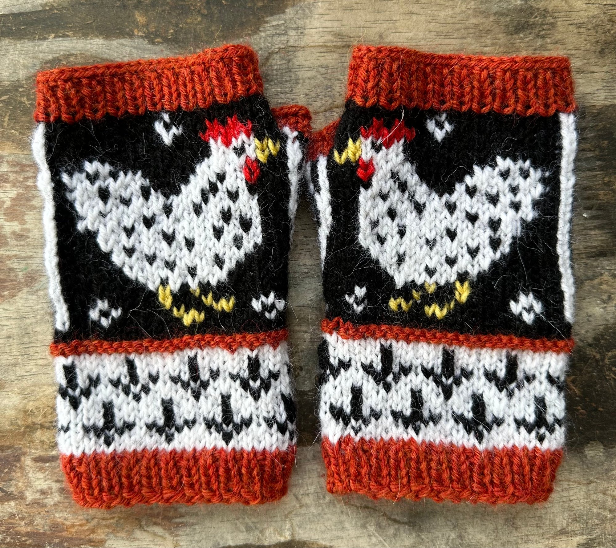 Cozy fingerless mittens with sweet farm hens will keep hands warm and comfortable in any season.