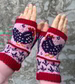 Cozy fingerless mittens with sweet farm hens will keep hands warm and comfortable in any season.