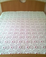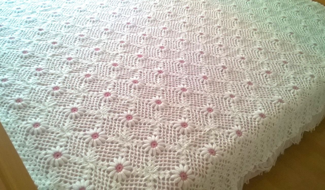 Twin size semi-wool hand crocheted bedspread with floral pattern.